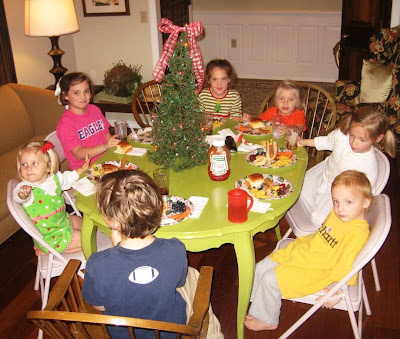 I made the Buttermilk Pies because we had special company last night! Justin's aunt & uncle, his mom & dad... and my 5 nieces & nephews! We had a delightful evening and the kids ran wild. Several of you asked for the recipe for the pies... the recipe I used called for you to beat the egg whites to stiff peaks... which resulted in a big mess and overflowing pies. All the other recipes I've found don't call for you to beat the whites... so, I'm passing along this recipe {based on good reviews}:: Buttermilk Pie. It calls for everything mine did except the beating of the whites. Buttermilk Pie is wonderful... if you've never had it, it's a custard pie and delicious; sweet and creamy and the top gets golden brown like Creme Brulee. It's easy to make and I promise you won't be disappointed if you try it!The kids had a table all their own. I found the little lime green treasure at my favorite antique mall. It has 2 leaves {I probably should have put BOTH in} and is used as a side table {sans leaves} until company arrives... especially little company.